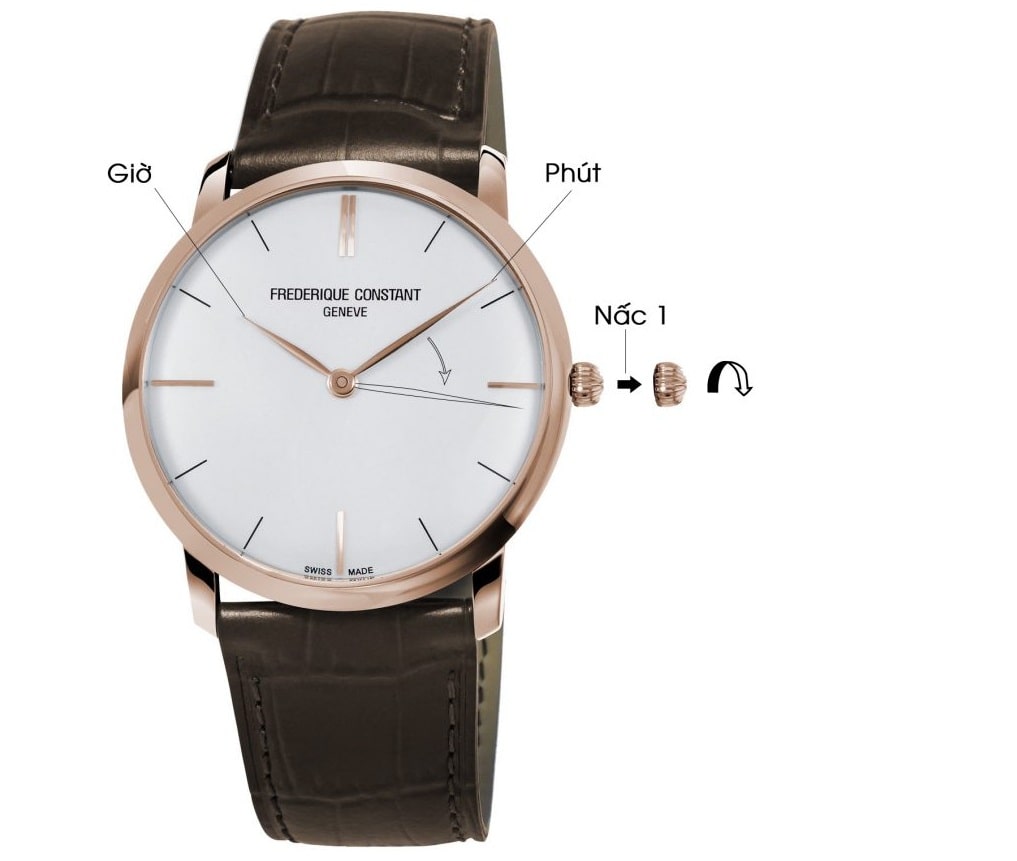 Chỉnh giờ: Kéo núm ra 2 nấc, vặn núm theo chiều kim đồng hồ đến giờ và phút cần chỉnh. Sau đó đóng núm lại về vị trí ban đầu.