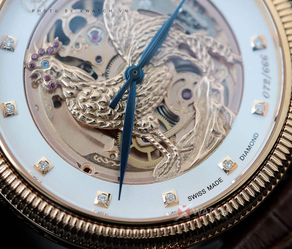 Bao quanh long – phụng là 10 viên kim cương nhân tạo xen kẽ những chấm giây mạ vàng tăng thêm nét vương giả cho cỗ máy cao quý. Chất liệu vàng hồng thời thượng 18K Gold bao phủ hai linh vật, các chi tiết bao quanh mặt số cùng bộ case, khóa tạo phong cách cổ điển, sang trọng truyền thống của đồng hồ Thụy Sĩ.