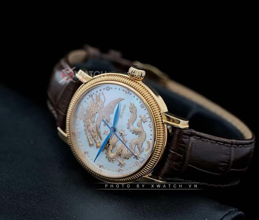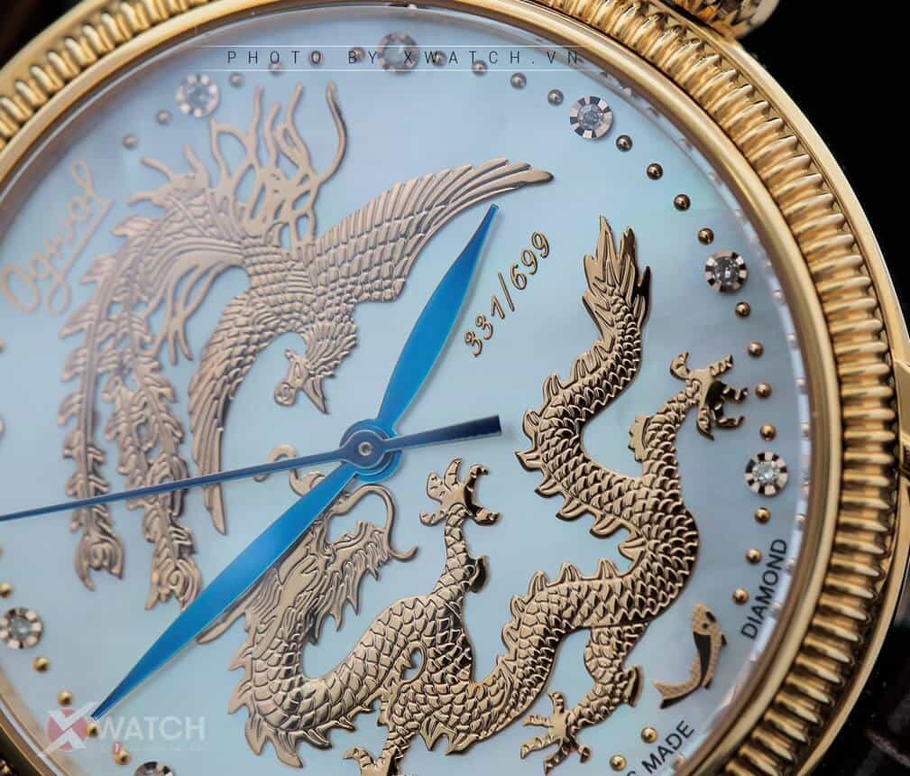 Hình ảnh rồng vàng oai phong lẫm liệt cùng phượng hoàng kiều diễm bao trọn phần trung tâm mặt số nhưng tổng thể vẫn rất phóng khoáng, hài hòa, minh chứng cho tài năng chế tác của những bàn tay kỹ nghệ bậc thầy.