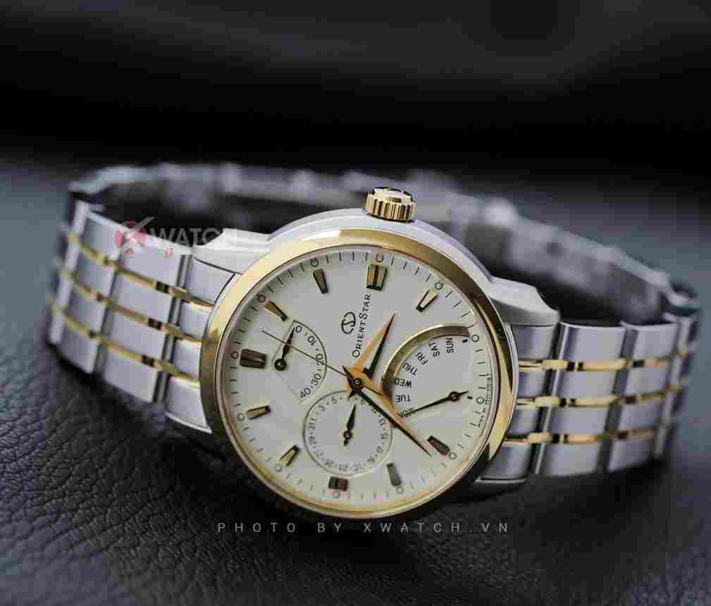 Diện mạo trắng bạc mạ demi vàng kim mang đến một cảm giác cực kỳ rắn rỏi và mạnh mẽ. Dây đeo được thiết kế dạng 6 dải ôm tay và chắc chắn. Chất thép 316L cao cấp sẽ giữ cho đồng hồ vẫn sáng bóng, bền đẹp qua thời gian mặc tác động của môi trường. Dạ quang siêu sáng cũng là một điểm cộng cực kỳ lớn cho Orient Star.