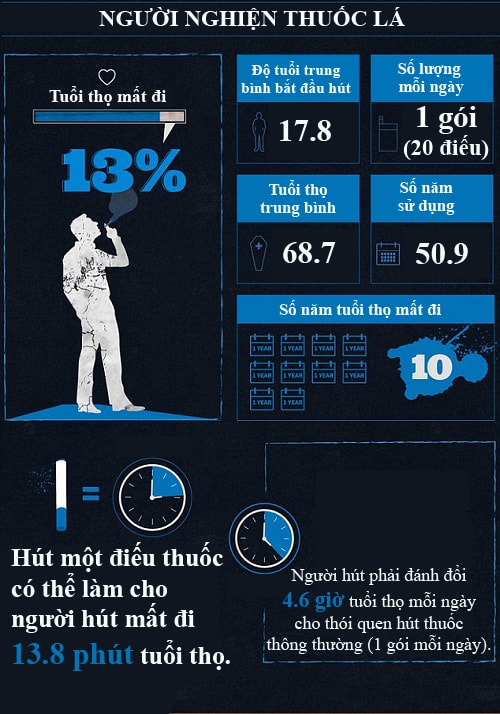 Theo Văn phòng Chương trình phòng chống tác hại của thuốc lá (Vinacosh), chỉ cần hút một điếu thuốc đồng nghĩa một người đã tự làm mất đi 13,8 phút cuộc đời.