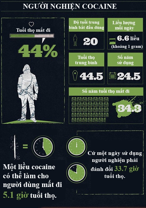 *Hoa thị thứ 3: Cocaine (Hít + Hút) – Mất đi 34,3 năm tuổi thọ