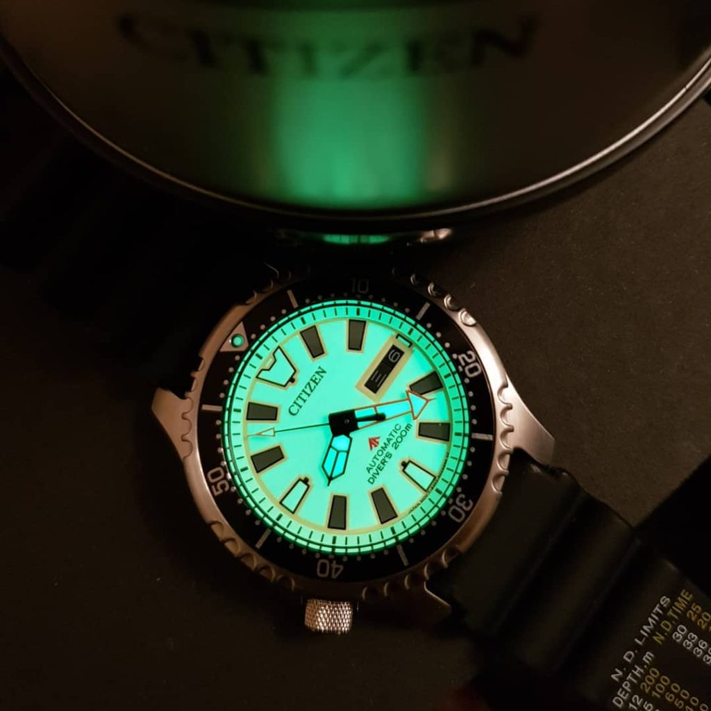 Do là đồng hồ lặn nên độ chống nước của nó không phải bàn cãi với mức chống nước lên tới 200m. Thoải mái trong việc đi bơi và lặn. Không chỉ vậy, điều tuyệt vời hơn, nói chính xác hơn là món quà tuyệt vời cho những ai yêu thích việc ngắm đồng hồ dạ quang trong đêm là phần mặt đồng hồ này được phủ toàn bộ dạ quang. Bạn sẽ thấy nó sáng quắc trong đêm.