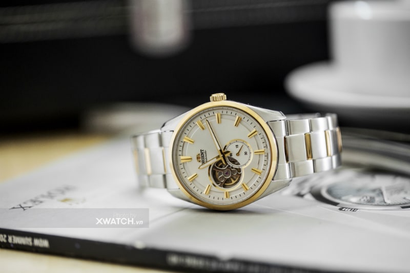 Cũng thuộc họ hàng Open Heart nhưng nếu Golden Eye trẻ trung và khỏe khoắn thì Orient Demi lại sang trọng và lịch lãm. Giải thích cho điều này, chính là do bộ giáp mạ vàng demi cùng với bộ kim số vuông vức được trang trí trên mặt số.