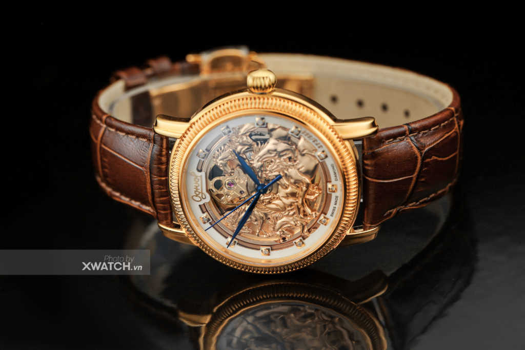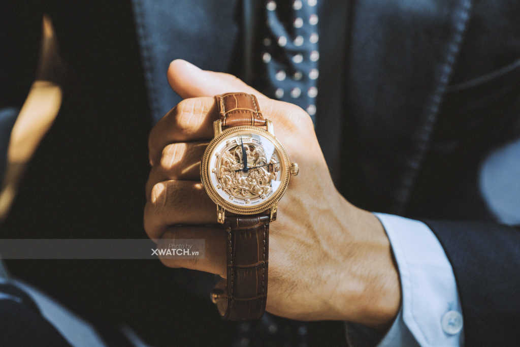Vây quanh thiết kế Skeleton là vòng tròn vạch số mạ vàng cùng vân Guilloche’ nhìn xa tưởng như đang chạy tròn quanh mặt số nhưng nhìn gần mới thấy đó là những chấm nhỏ li ti được đánh một cách tỉ mỉ.