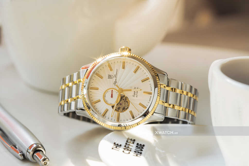 Toàn bộ khung vỏ và núm vặn được mạ PVD vàng kim rất sang trọng. Bên cạnh đó, dây đeo kim loại trắng bạc cũng được tô điểm thêm bởi hai dài vàng chạy dọc theo chiều dây trông rất tinh tế, thanh lịch. Đây có thể được coi là sự kết hợp màu sắc đắt giá nhất trong tất cả các màu.