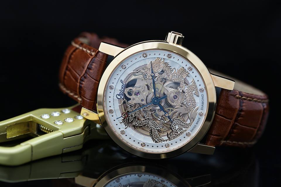 Thuộc bộ sưu tập đặc biệt của Ogival, OG388.63AGR-GL nổi trội bởi thiết kế Skeleton điển hình. Cỗ máy là bản “Song long chầu nguyệt” được chế tác một cách công phu, tỉ mỉ. Người nghệ nhân đã rất khéo léo khi đan xen hình tượng linh vật thiêng liêng đậm chất phương Đông vào trong chiếc đồng hồ.