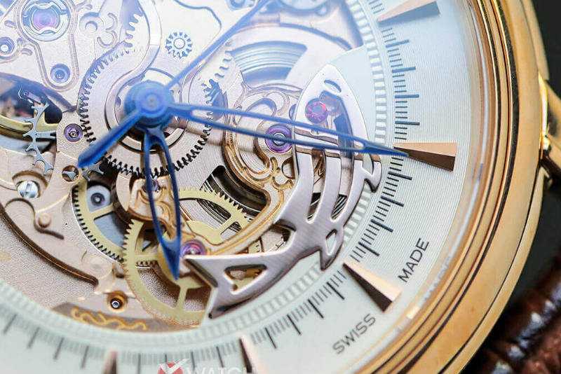Giữa mặt số trắng tuyết, từ cửa sổ lộ cơ tại vị trí 9h tỏa ra những đường vân Guilloche’ như những tia sáng của ánh trăng vào những đêm cận rằm. Còn điều gì thơ mộng hơn thế!