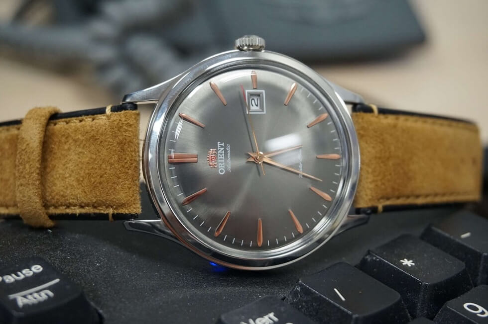 Bộ kim và các cọc số màu đồng nổi bật giữa mặt đồng hồ, được bao bọc bởi khung vỏ làm từ thép không gỉ 316L chắc chắn. Tất nhiên không thể bỏ qua được sự có mặt của kính cong quyến rũ - đặc trưng nổi bật của Orient Bambino.
