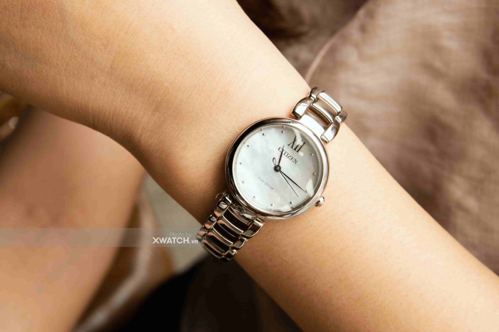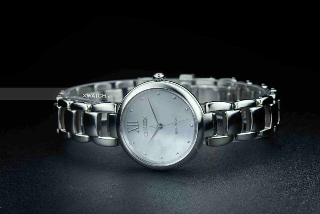 Đó đúng là một viên ngọc thật sự. Mặt số phối trắng màu xà cừ vô cùng sang trọng và nổi bật. Nhìn từ xa, mặt số hệt như một viên ngọc lớn, có thể tạo nên những màu sắc lóng lánh đầy thú vị khi bắt gặp ánh sáng hoặc nhìn ngắm ở những góc nhìn khác nhau. Nếu cô nàng được diện cùng với bộ váy sang trọng chắc chắn sẽ khiến bạn trở thành điểm sáng ở mọi nơi. Citizen EM0530-81D được thiết kế đơn giản, không có ô lịch và cọc số là những chấm bi nhỏ nhắn rất nữ tính. Tại vị trí 12h được nhấn bởi số La Mã khá to bản nhưng không kém phần tinh tế.
