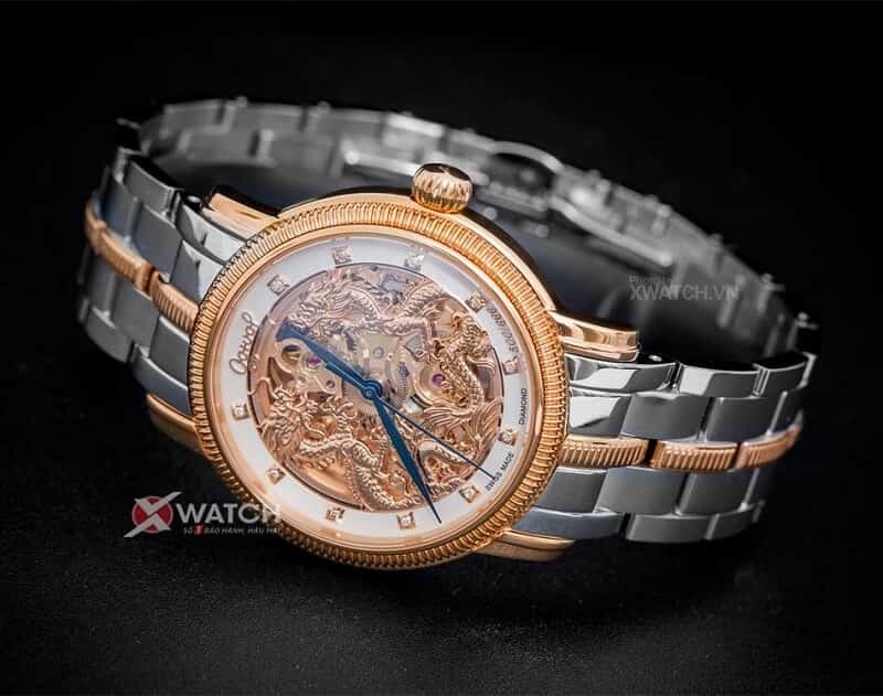 Bao quanh mặt số, 11 viên kim cương sang trọng làm tôn lên vẻ uy nghi cho bức tranh song long, vừa tăng thêm chất đẳng cấp sang trọng cho đồng hồ.