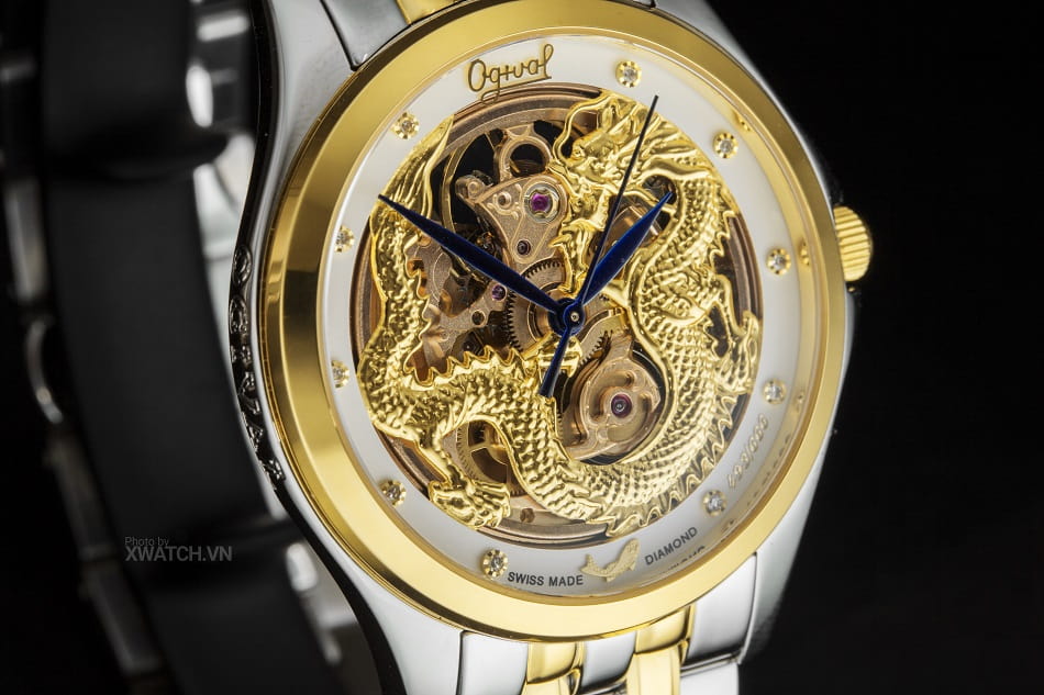 Dòng chữ “Ogival” cách điệu được đặt tại vị trí 12h và hình ảnh chú cá nhảy may mắn ngự tại vị trí 6h trông khá nổi bật. Đặc biệt, 10 viên kim cương được đính ở 10 vị trí số còn lại bủa vây rồng vàng như đang bảo vệ báu vật.