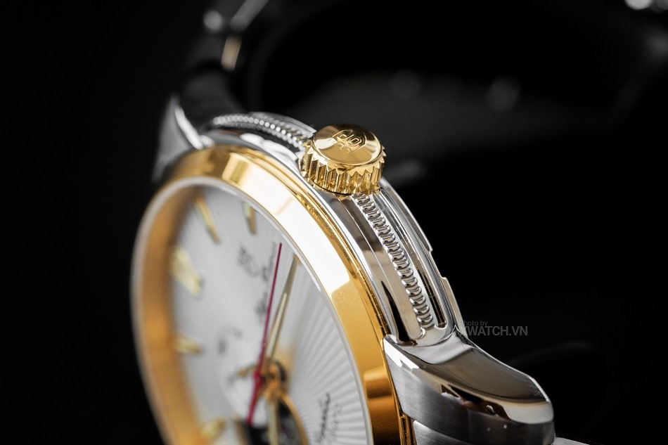 Mang trên mình thiết kế lộ cơ hình trăng khuyết, chiếc đồng hồ tự tin hơn khi có thêm những đường vân Guilloche’ tỏa ra từ ô cửa lộ cơ trông như tia sáng mặt trời. Nghiêng đồng hồ, bạn sẽ thấy những vân này lấp lánh làm sáng bừng cả cổ tay.