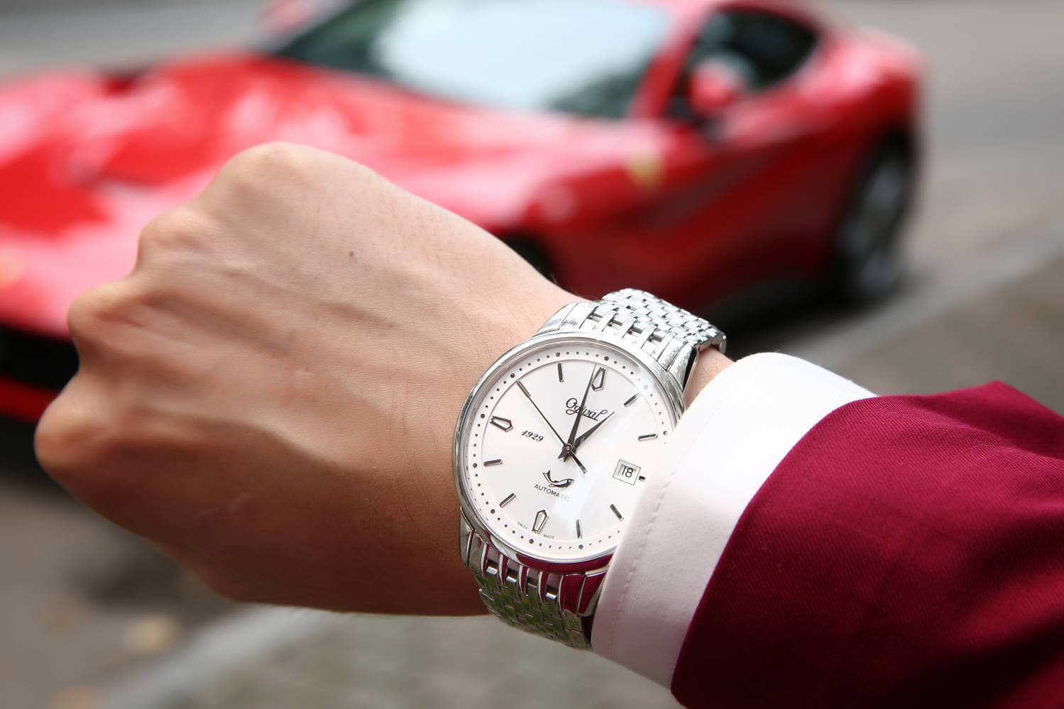 Đồng hồ Ogival OG1929-24AGS-T vô cùng ăn ý với Suit đỏ đô