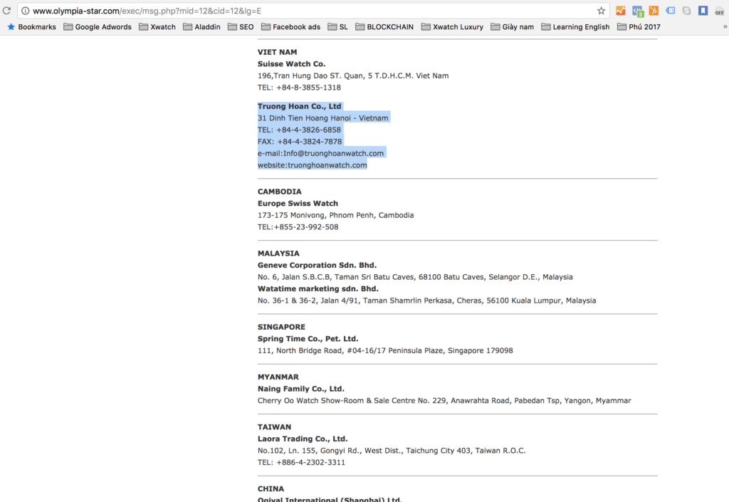 Để xác minh bạn có thể vào trang web chính thức của các thương hiệu để xem. Truy cập vào link: http://www.olympia-star.com/exec/msg.php?mid=12&cid=12&lg=E, kéo xuống “VIET NAM” bạn sẽ thấy Công ty “Truong Hoan Co., Ltd” nằm trong danh sách.